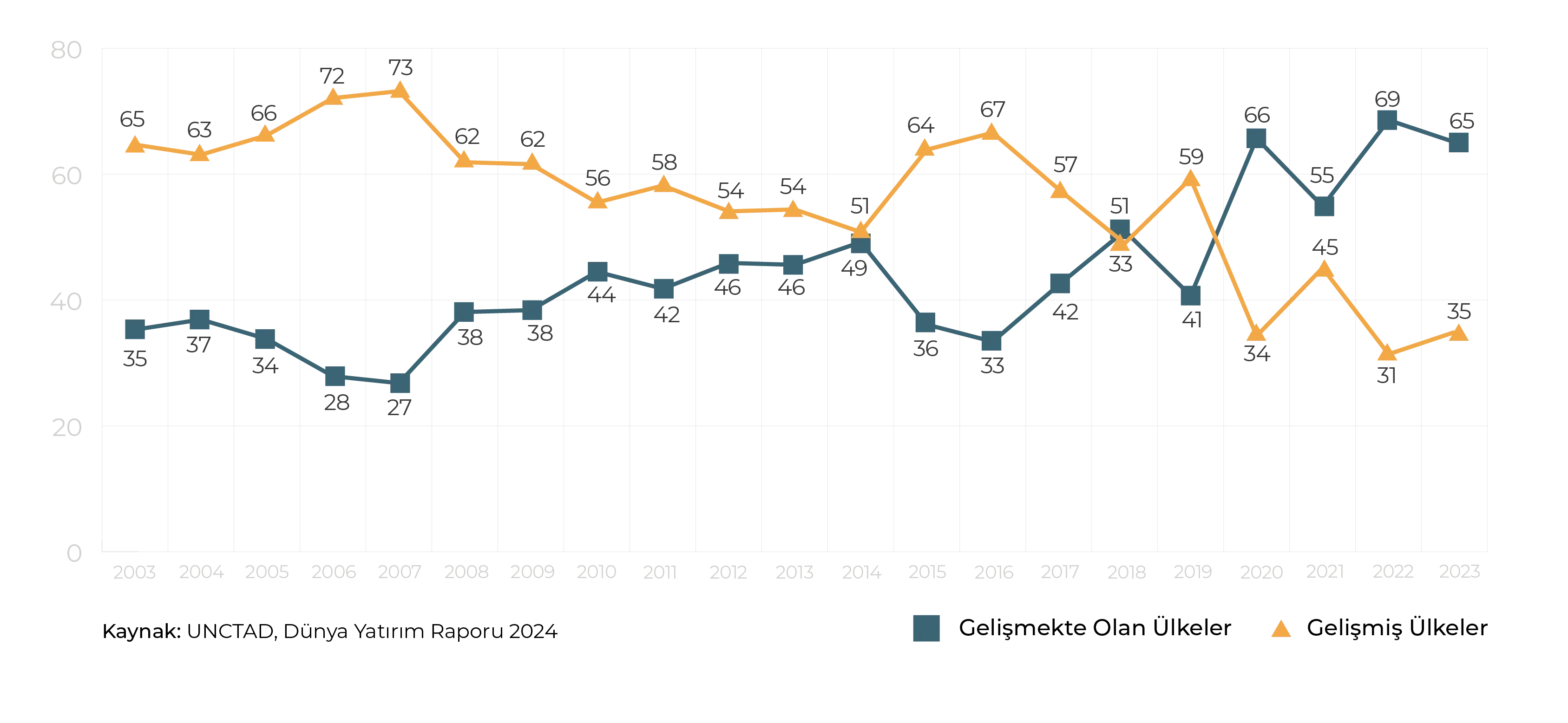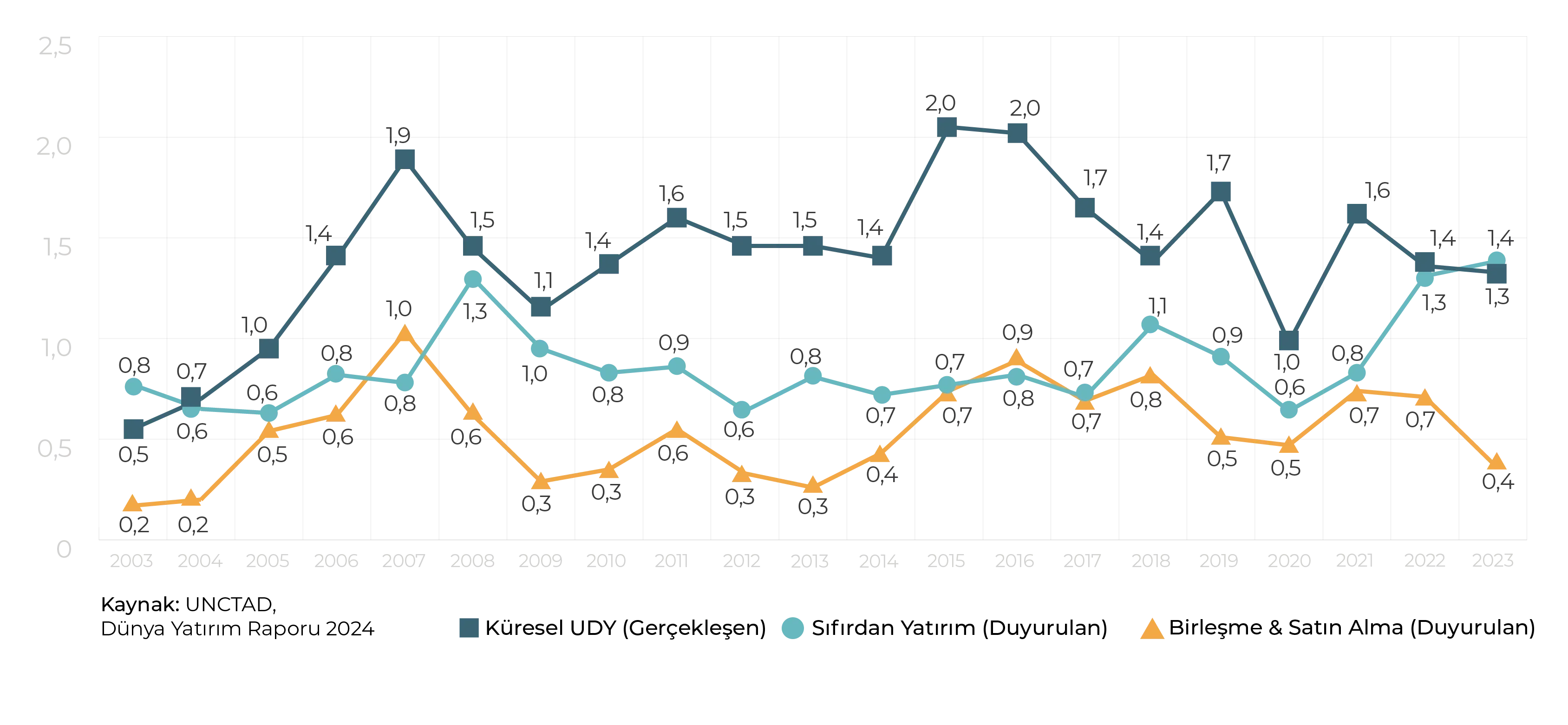 2008 küresel finansal krizinden bu yana küresel doğrudan yatırım akımları genel olarak durağan bir seyir izlemekte, ancak son yıllarda dikkat çekici dalgalanmalar yaşanmaktadır. COVID-19 pandemisi, 2020 yılında keskin bir düşüşe yol açmış, 2021 yılında ise birleşme ve satın alma (M&A) işlemlerinin etkisiyle geçici bir artış görülmüştür. Ancak bu toparlanma kısa ömürlü olmuş, yükselen enflasyon ve jeopolitik gerilimler küresel yatırımlarda yeniden aşağı yönlü bir eğilimi tetiklemiştir. Pandemi aynı zamanda küresel tedarik zincirlerinde dönüşüme neden olmuş; yeşil ve dijital sektörlere yönelik yatırımları hızlandırmıştır. Öte yandan, 2018’den bu yana gelişmekte olan ülkeler, gelişmiş ülkelere kıyasla daha fazla doğrudan yatırım çekmektedir. Bu eğilim 2020 sonrası dönemde de devam etmektedir.